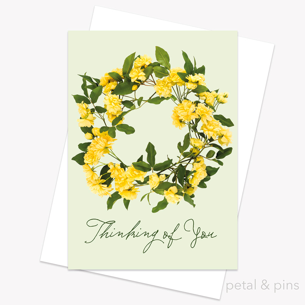 Thinking of you greeting card featuring a yellow rose garland designed with banksia roses from the petal & pins garden.